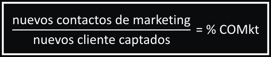 En esta fórmula, los nuevos contactos de marketing son el porcentaje de contactos generados directamente por el departamento, para lo cual se ha de averiguar cuántos de ellos se contactaron o generaron inicialmente por las acciones de marketing (mkt). Mientras, los nuevos clientes captados son el total de clientes en un mes o en el período que se quiera medir.