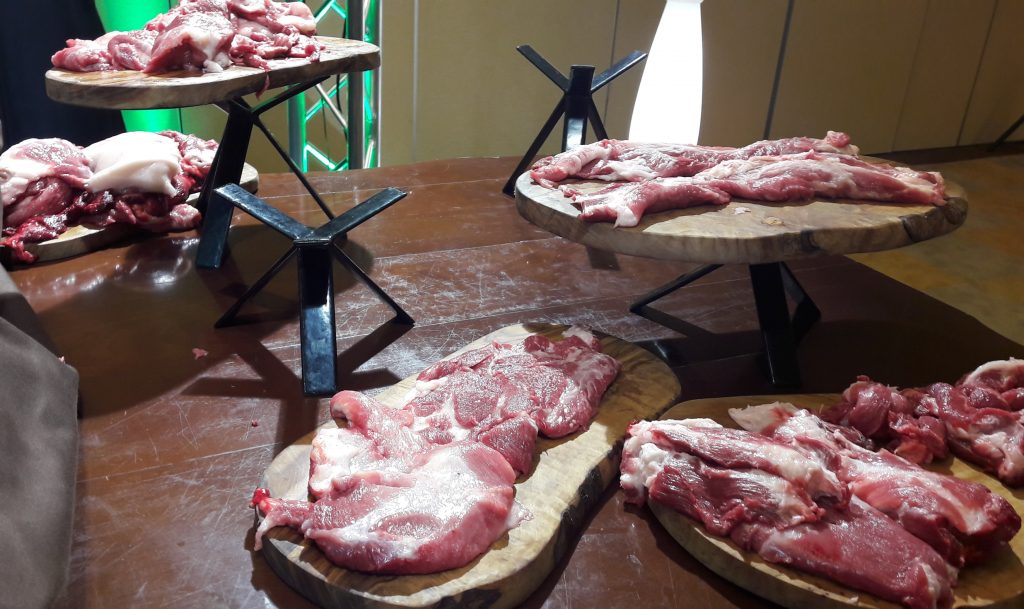 Los invitados fuimos testigos de una clase magistral, esta sí, con la habilidad con la gumia (uno de los cuchillos de corte) y con animales emblemáticos en el sector alimentario y que sirven la producción del apreciadísimo jamón ibérico y todo tipo de embutidos que tenemos en mente.