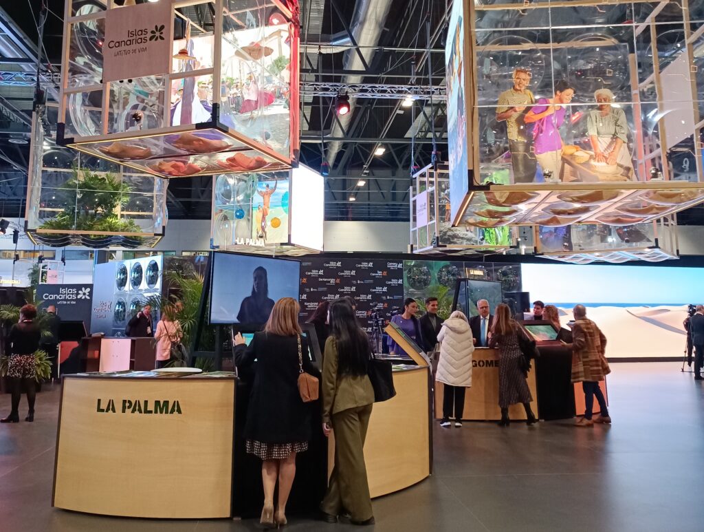 - El stand de Islas Canarias: nos gustaría cerrar este post haciendo un breve repaso a las principales temáticas que pudimos ver estos días en las cajas de cristal que colgaban del techo de Ifema a modo de escaparte: sol y playa, turismo activo, naturaleza, cultura y patrimonio y turismo LGTBI. Siempre desde un punto de vista ecológico, estuvo también presente nuestra flora y fauna y, como no, nuestra gastronomía. Los visitantes pueden degustar visitando este stand jugos de frutas, vinos de la tierra, quesos y otras opciones de comida típica.