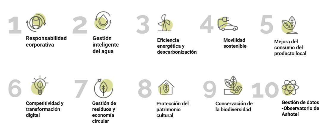 La estrategia se articula en torno a diez líneas clave de actuación, que abarcan desde la eficiencia energética y la gestión inteligente del agua, hasta la movilidad sostenible, el consumo de producto local o la protección del patrimonio cultural. Cada una de estas líneas se traduce en compromisos concretos que los establecimientos pueden adoptar de forma progresiva, con el acompañamiento técnico de Ashotel y el respaldo de herramientas como el Observatorio de Competitividad Turística y Desarrollo Sostenible de la patronal.