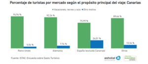 En 2024, el 90,39% de los turistas que visitaron las islas tenían como propósito principal del viaje las vacaciones, recreo y ocio, frente al 9,61% que lo hizo por otros motivos. Por mercados, Reino Unido fue el que presentó un valor superior en cuanto a esta motivación, un 94,76%, frente al mercado nacional que se situó en el 75,99%. Por islas, Lanzarote, con un 95% de turistas que la visitaron por motivo de vacaciones, recreo y ocio es la que mostró un dato mayor, siendo Gran Canaria, con un 85,93% la que presentó un valor menor. En este caso no se tienen en cuenta La Gomera y El Hierro, ya que la encuesta no proporciona información sobre estas dos islas.