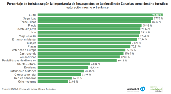 Por último, también resulta relevante conocer la importancia que tienen algunos aspectos en la elección de Canarias como destino turístico. En la encuesta se muestra información sobre un total de 20. Entre ellos y teniendo en cuenta las respuestas que consideran que tienen mucha o bastante importancia a la hora de decidir, el principal es el clima, con un 95,48%, seguido de la seguridad (87,96%) y la tranquilidad (86,70%). Por encima del 70% y completando la lista de los 10 aspectos más valorados se encuentran el precio (79,52%), la oferta alojativa (78,46%), el mar (78,14%), el hecho de que se trate de un viaje sencillo (77,45%), el entorno ambiental (75,96%), los paisajes (71,29%) y las playas (70,81%). Con una valoración de mucho o bastante por encima del 50% se encuentran también el hecho de que el destino pertenece a Europa (67,15%), la gastronomía (65,64%), la autenticidad (62,80%) y las posibilidades de diversión (60,45%). Como aspectos menos influyentes a la hora de decidir el destino de vacaciones se encuentran la oferta cultural (40,02%), el exotismo (38,73%), el patrimonio histórico (35,45%), la oferta comercial (32,99%), la red de senderos (26,13%) y el ocio nocturno (22,95%).