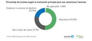 En cuanto a los motivos principales para visitar Canarias, para la mitad (49,56%) el descanso es el primero, el 20,76% lo hace para explorar o conocer el destino y el 27,70% por otras razones. Por islas, el descanso es la principal motivación en cuatro de las cinco analizadas, superando el 50% en Lanzarote (55,32%), Fuerteventura (54,29%) y Gran Canaria (52,52%). En Tenerife es la motivación principal para el 44,15% de los turistas que visitan la isla. Los turistas que eligen La Palma, en cambio, presentan un comportamiento diferente, siendo explorar o conocer el destino la motivación principal para el 53,19% y el descanso para el 26,19%.