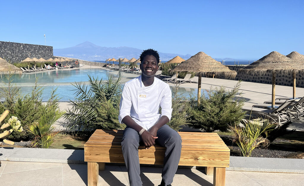 Nama (Bamako, Mali) cumplirá 18 años el próximo enero. Llegó en cayuco a El Hierro en enero de 2024, desde Mauritania, en un difícil viaje de tres días. Afortunadamente, pudo llegar bien a tierra y, al ser menor de edad, a través de la asociación Coliseo, por encargo del Gobierno de Canarias, fue trasladado a La Gomera. Allí le enseñaron español, finalizó la ESO y, después, terminó el Grado Básico de Cocina. Ahora estudia el Grado Medio mientras compagina con su trabajo desde marzo como ayudante de Cocina en Bancal Hotel & Spa, empresa hotelera en la que realizó sus prácticas. Su buena actitud e implicación le valió una más que justa oferta de empleo. Es el mayor de cinco hermanos, dos chicas y dos chicos, que viven con su familia en Bamako. Asegura que la cocina de su país tiene bastantes similitudes con la canaria, y en ella predominan las verduras y el arroz. Le gustaría viajar y aprender de otras cocinas del mundo, quizá en otra ciudad o lugar de Europa y sueña, por qué no, con abrir su propio restaurante en un futuro. El pasado 26 de noviembre fue propuesto por su empresa para recibir el reconocimiento que Ashotel organiza cada año entre sus asociados para poner en valor la dedicación, profesionalidad y compañerismo de las personas trabajadoras del sector hotelero. Y, además, tuvo el honor de dirigir unas palabras a las más de 200 personas presentes en el acto, celebrado en Puerto de la Cruz.